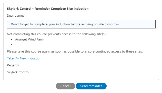 The Skylark platform allows the option to re-send a user's induction invite if they have not yet completed via a Site Admin or Site Owner account.