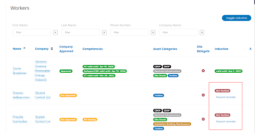 From here, you can view the workers assigned to site and Induction status. If a user has yet to complete their induction, the option to re-send is available.